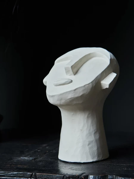 The perfect addition to your shelving or console. His interesting expression immediately elevates a space. Pop in your hallway to instantly wow your guests. Materials: Cement Dimensions: L8 x W8 x H14.5 cm Due to the hand crafted nature of our sculptures, each is truly unique and any imperfections should be celebrated.