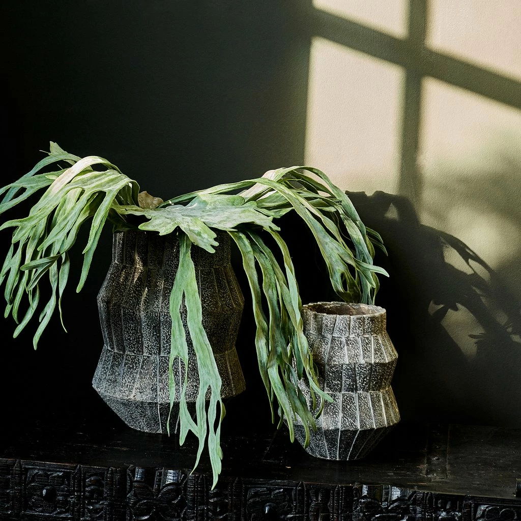 Inspired by the african plains and ancient traditions, our pablo vessels have a rare spirit and rock a tribal sensibility. They come in two sizes large and medium and look lovely when clustered together. Materials: Concrete. Dimensions: Dia 21cm H24.5cm. Not intended to hold water. Due to the handmade nature of this vessel, each is truly unique and variations in shape, texture, colour may occur.