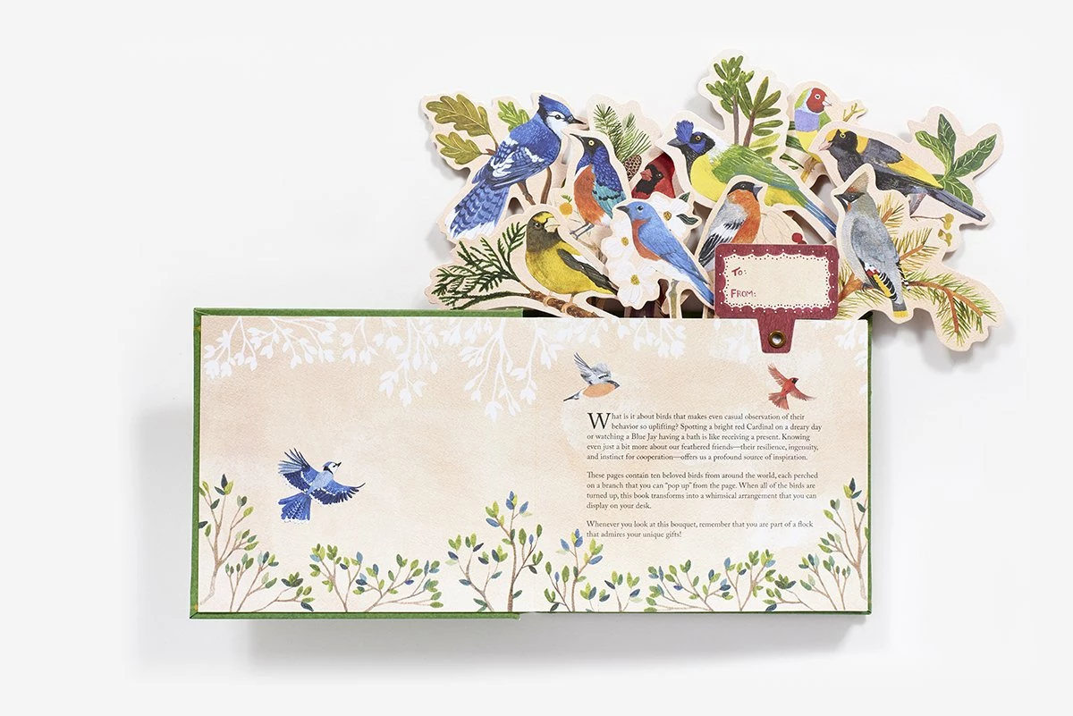 This unique gift book transforms into a decorative object, featuring ten beloved birds from around the world. Each bird is perched on a die-cut branch that you can “pop up” from the page. Simply take the jacket off, pop up the birds, and turn this book into a whimsical arrangement to display on a desk or shelf. The accompanying text details the special attributes of each bird: the resourcefulness of the Blue Jay, the loyalty of the Bullfinch, and the family devotion of the Inca Jay. A wonderful gift for a bird-watcher or nature enthusiast, this book also features a pop-up “to/from” card, so you can dedicate it to someone special. Birds featured in this book include: Eastern Bluebird, Evening Grosbeak, Bullfinch, Bohemian Waxwing, Superb Starling, Regent Bowerbird, Inca Jay, Gouldian Finch, Northern Cardinal, and Blue Jay.Check out the other books in this trademarked series: Happy Day: A Bouquet in a Book, Thinking of You: A Bouquet in a Book, Succulents in a Book, and Party in a Book. Product details Format: Hardback Publication Date: 5 February 2019 Pages: 24 Height: 13.3 cm Width: 15.2 cm Illustrations: Hardback gift book. Full-colour illustrations throughout Creator Bio LESLIE EARLE (aka Lesley the Bird Nerd) is an obsessive birdwatcher, who spends every day in the forests of her native Newfoundland capturing bird behavior on camera for her Etsy shop, YouTube channel, and Facebook community. She resides in Corner Brook, Newfoundland RACHEL GRANT is an illustrator and pattern designer whose clients include Madison Park Greetings, American Greetings for Target, Midwest CBK Home décor, TJX Group, and Design House Greetings for Trader Joe’s. She resides in North Staffordshire, England