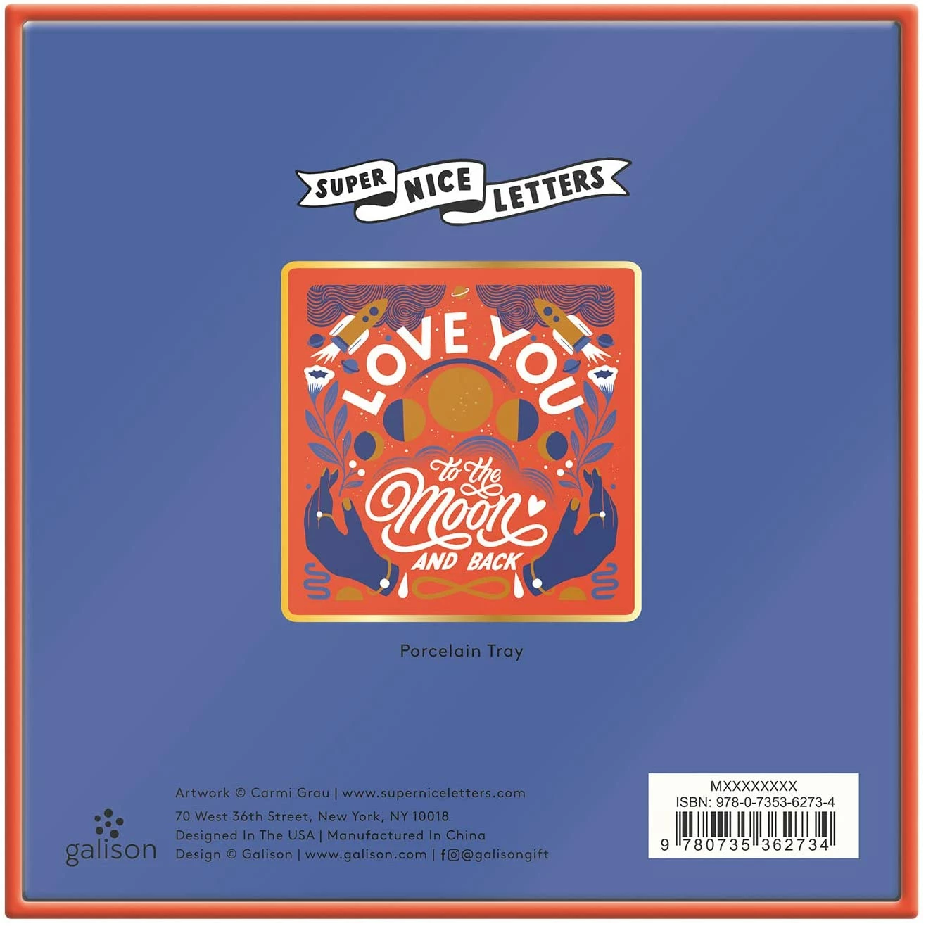 Based in Berlin, Carmi Grau’s illustrations are inspired by the beauty of nature. She creates bold visuals by using her own vocabulary of colors and shapes. This square porcelain tray from Galison features the phrase, “Love You To The Moon And Back,” along with bright and colorful illustrations. Measuring 5.25” x 5.25”, this square tray has gold gilded edges and is ideal for holding loose change, jewellery, car keys, small trinkets and more. It’s also neatly packaged in a 2-piece gift box with a window, making it the ideal any-occasion gift with no wrapping required. Product details Format: Tray Publication Date: 21 January 2020 Height: 14 cm Width: 14 cm Creator Bio Galison was founded in 1979 to work with museums to make artist imagery widely available in the form of well-designed paper products. With new collections each year, Galison has broadened its assortment well beyond stationery to puzzles and games, office products, home décor, and more. Their vision is to inspire people by adding more art to daily life with the products they create.