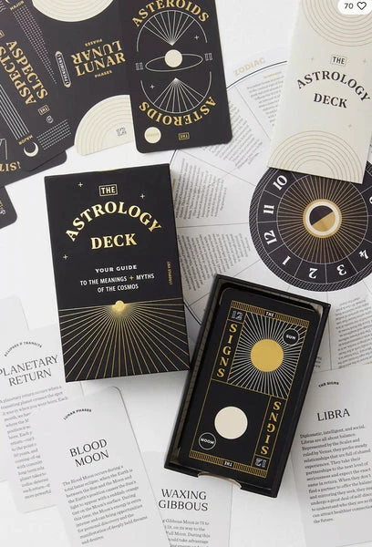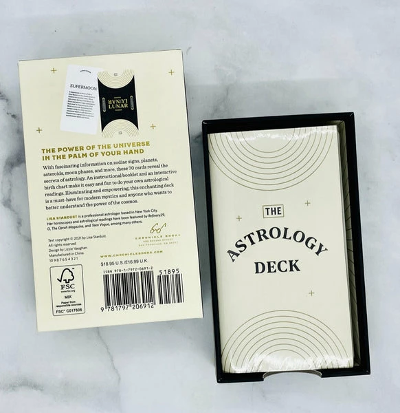 An enchanting and fun-to-use deck packed with all the secrets of astrology. This luminous 70-card deck is filled with fascinating information on zodiac signs, planets, asteroids, eclipses, and more. Users will discover how celestial phenomena like retrogrades, moon phases, and sun signs impact love, friendship, career, and personality. An accompanying instructional booklet and an interactive birth chart make it easy and fun to do astrological readings, alone or with friends. Illuminating and empowering, this deck is a must-have accessory for modern mystics and the spiritually curious.Lisa Stardust is a professional astrologer who has been practicing and teaching astrology for more than a decade. In this deck, she shares her expert wisdom, distilling the essential secrets of astrology in an engaging and easy-to-use set of cards so that users can interpret the stars and do their own readings.This interactive and fun-to-use deck can be used in a variety of ways: Users can pull one card a day to learn something new about the cosmos; pull several cards at once to see what energy the universe has in store; do their own birth chart to better understand what the future holds; or do readings with their friends, making it the perfect edition for a small gathering or a girls’ night in.
