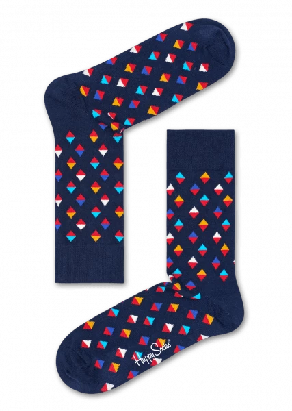 Stylishly sparkle with our Mini Diamond sock. A traditional diamond pattern is studded across these classic navy blue socks, but on closer inspection you can see each diamond is made of triangles in red, cream, ice blue, sky blue, bright blue and golden yellow for a contemporary update. The heel, toe and cuff of these comfortable combed cotton socks are all in navy blue. COLOURS Blue, Red, Turquoise, Yellow PATTERN Mini Diamond